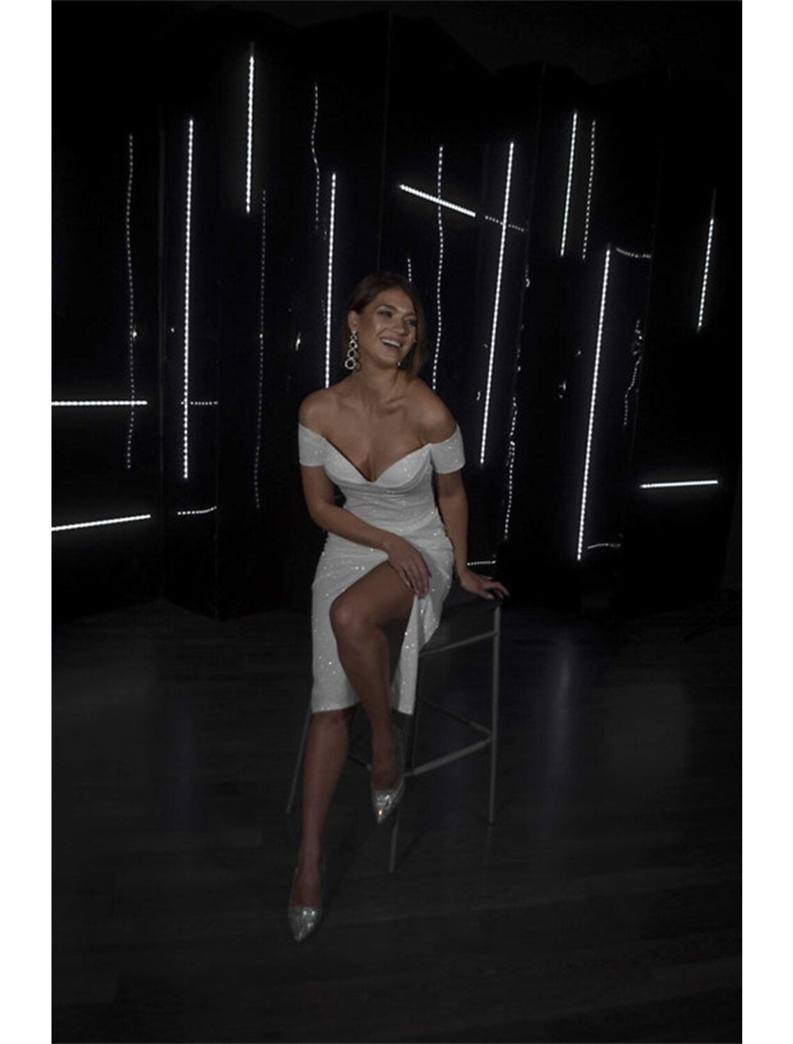 Vestidos de novia blancos pequeños, brillantes y con brillo para despedida de soltera, vestidos de novia con corte tubo/columna, hombros descubiertos, mangas cortas, largo hasta la rodilla, con lentejuelas y abertura frontal fruncida.