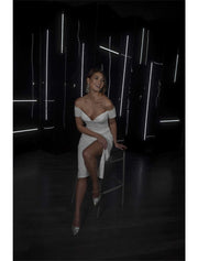 Vestidos de novia blancos pequeños, brillantes y con brillo para despedida de soltera, vestidos de novia con corte tubo/columna, hombros descubiertos, mangas cortas, largo hasta la rodilla, con lentejuelas y abertura frontal fruncida. - EE. UU. 2 / Reino Unido 6 / UE 32