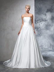 Vestidos de novia largos de satén sin tirantes, fruncidos y sin mangas