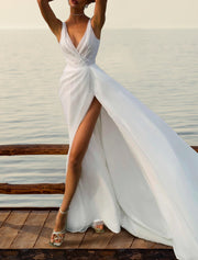 Vestidos de novia bohemios de playa, corte A, escote en V, sin mangas, cola de corte, de gasa, con abertura frontal, color liso