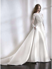 Vestidos de novia formales de playa, cola capilla, corte A, manga larga con pliegues de encaje - EE. UU. 2 / Reino Unido 6 / UE 32