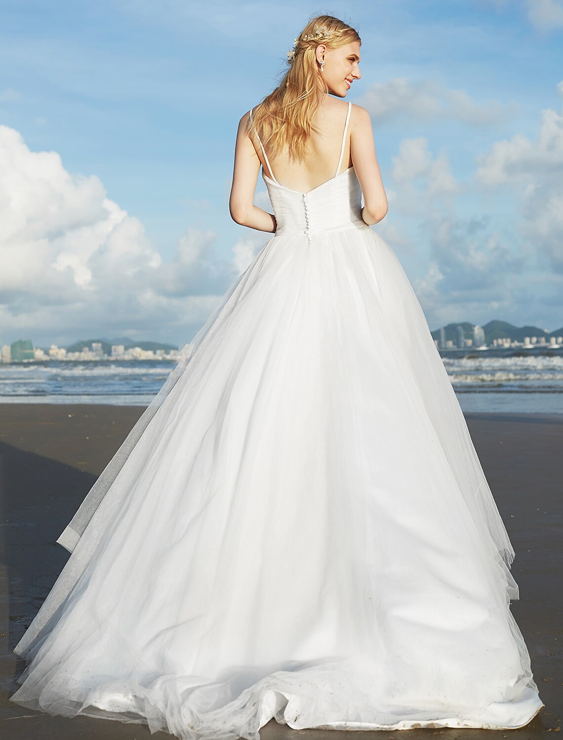 Vestidos de novia de playa, corte A, tirantes finos, sin mangas, cola larga, de gasa, con fajas y cintas.