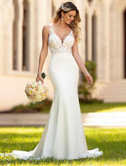 Vestidos de novia formales, sexys, de compromiso, con espalda abierta, corte sirena/trompeta, escote en V, sin mangas, cola de corte, de encaje y apliques
