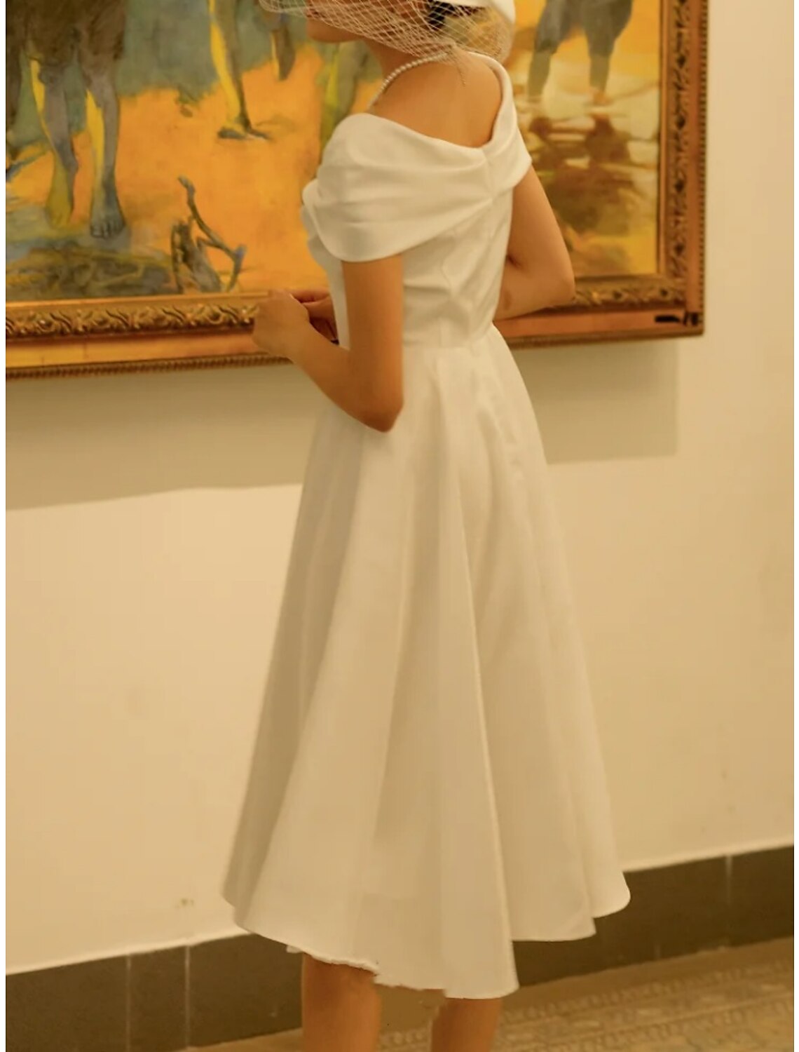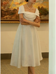 Vestidos de novia blancos cortos, corte A, escote cuadrado, manga corta, largo hasta la rodilla, de satén, con pliegues y fruncido.