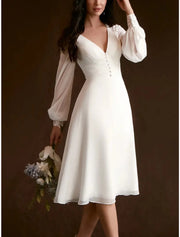 Vestidos de novia blancos cortos, corte A, escote en V, manga larga, largo hasta la rodilla, de gasa, con pliegues y fruncido.