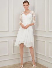 Vestidos de novia blancos de recepción, corte A, escote en V, media manga, largo hasta la rodilla, de gasa, con apliques drapeados.
