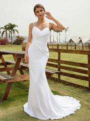 Vestido de novia de corte columna charmeuse, fruncido, escote en V, sin mangas, con cola de corte (cola desmontable)