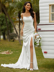 Vestido de novia de satén tejido, con tirantes finos fruncidos, sin mangas y cola de corte tubo/columna