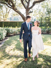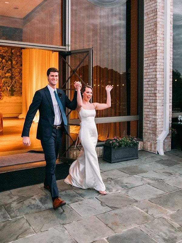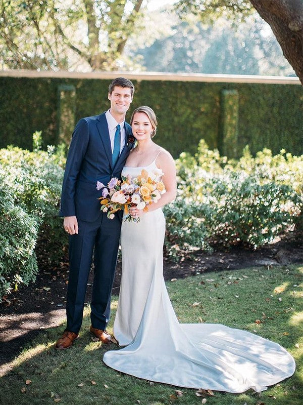 Vestidos de novia de satén tejido, con escote tubo y fruncido, cuadrados, sin mangas y con cola de corte