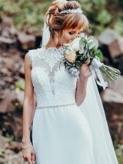 Vestidos de novia con corte tubo/columna, apliques de encaje, escote redondo, sin mangas y cola larga