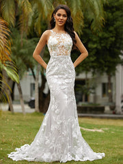 Vestidos de novia con corte tubo/columna, encaje, escote redondo, sin mangas y cola larga