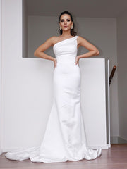 Vestidos de novia de satén con un solo hombro, fruncidos, sin mangas y con cola larga