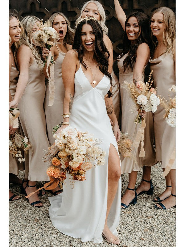 Vestidos de novia de corte tubo/columna, satén tipo seda, fruncido, escote en V, sin mangas, con cola larga