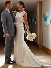 Vestidos de novia con corte tubo/columna, encaje de crepé elástico, escote redondo, mangas cortas y cola larga