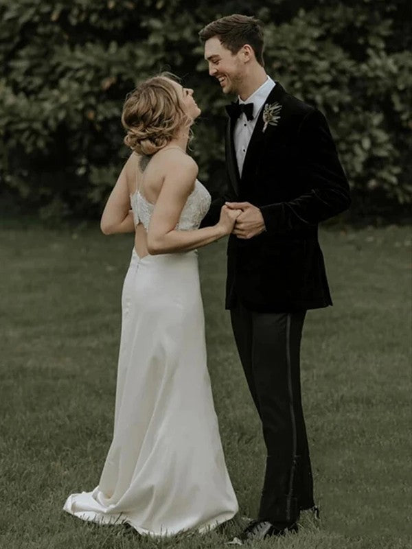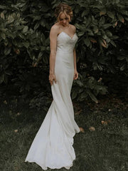 Vestidos de novia con corte tubo/columna, encaje crepé elástico, tirantes finos, sin mangas y cola larga - EE. UU. 2 / Reino Unido 6 / UE 32