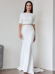 Vestidos de novia de corte tubo/columna, crepé elástico, fruncido, escote redondo, mangas 1/2, cola larga/cortada