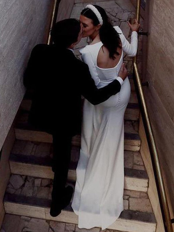 Vestidos de novia con corte tubo/columna, de crepé elástico, fruncido, cuadrado, mangas largas y cola larga