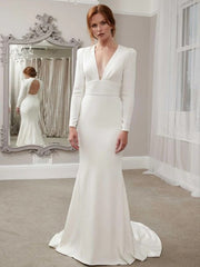 Vestidos de novia de corte tubo/columna, crepé elástico, volantes, escote en V, mangas largas y cola larga