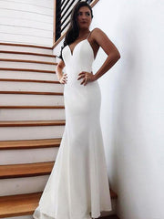 Vestido de novia de corte tubo/columna con volantes, escote en V, sin mangas y cola de corte