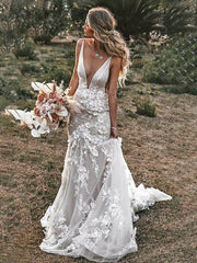 Vestidos de novia con escote en V, sin mangas, con apliques y cola de capilla de tul y tubo/columna