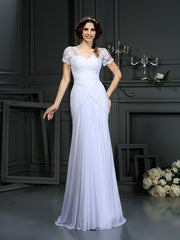 Vestidos de novia largos de gasa con mangas cortas y encaje, escote en V y corte tubo/columna