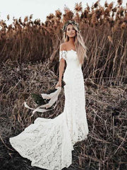 Vestidos de novia con apliques de encaje, corte trompeta/sirena, hombros descubiertos, mangas cortas y cola corte - EE. UU. 2 / Reino Unido 6 / UE 32