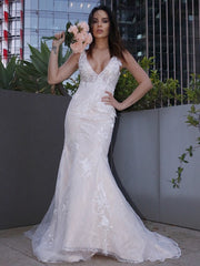 Vestidos de novia con apliques de encaje, corte trompeta/sirena, escote en V, sin mangas y cola larga