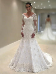 Vestidos de novia de corte sirena/trompeta, mangas largas, escote en V, cola de corte, apliques de encaje