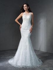 Vestidos de novia largos de encaje sin mangas con apliques y corte trompeta/sirena
