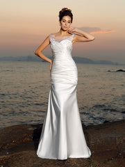 Vestidos de novia largos de satén para playa, sin mangas, con escote trompeta/sirena y cuentas