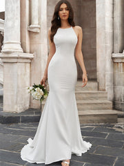 Vestidos de novia de corte trompeta/sirena, escote redondo, fruncido, de crepé elástico, sin mangas y con cola larga