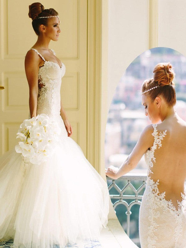 Vestidos de novia de tul con encaje, escote corazón, tirantes finos, sin mangas y corte trompeta/sirena - EE. UU. 2 / Reino Unido 6 / UE 32
