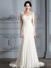Vestidos de novia de corte trompeta/sirena, sin mangas, con escote en V y encaje, con cola larga