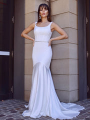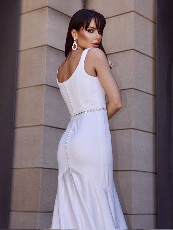 Vestidos de novia de corte trompeta/sirena con faja/cinturón cuadrado, sin mangas, de crepé elástico y cola larga