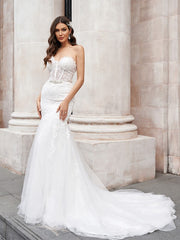Vestidos de novia de tul con escote en forma de corazón, sin mangas, con apliques y cola de corte trompeta/sirena