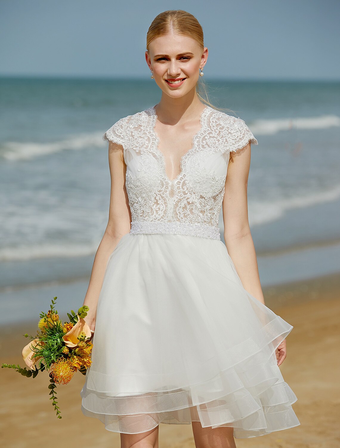 Vestidos de novia de corte A, escote en V, sin mangas, hasta la rodilla, de tul, con faja/cinta y abalorios