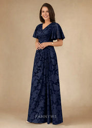 V - Neck Flutter Sleeve Floral Jacquard Mother of the Bride Dress. Occasions: Prom, black tie events, formal weddings, and upscale parties.