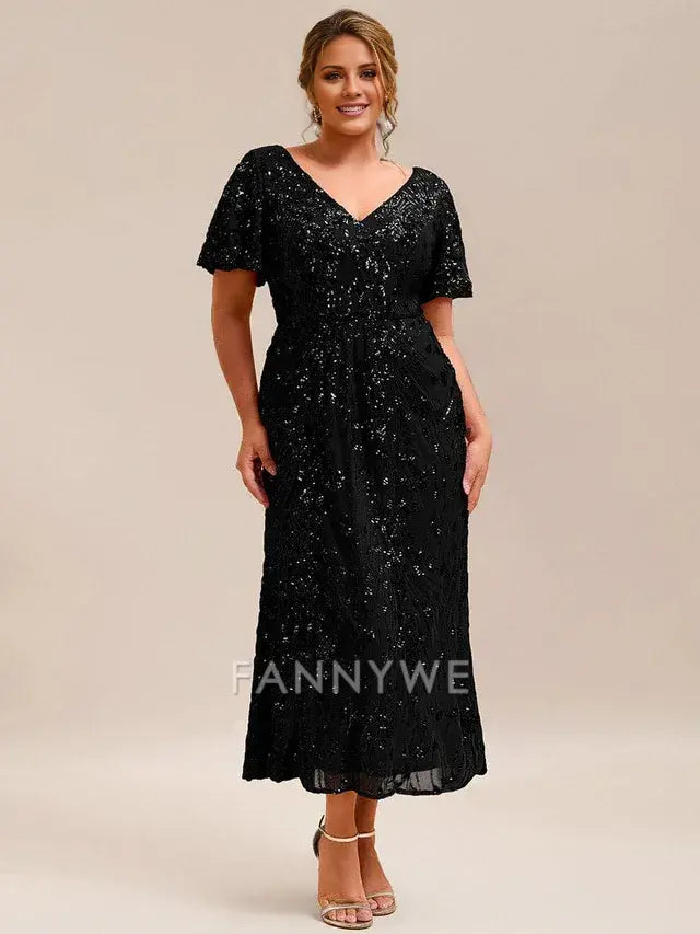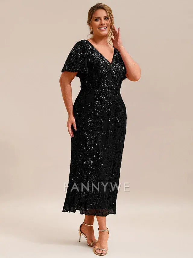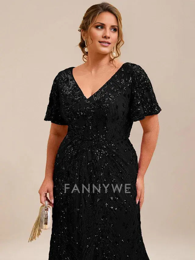 Gorgeous Plus Size V-Neck Flutter Sleeve Sequin Midi Dress Evening Dress