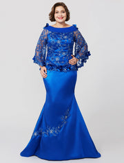 Mermaid / Trumpet Mother of the Bride Dress Formal Plus Size Elegant Bateau Neck Sweep / Brush Train Lace Over Charmeuse Long Sleeve No with Pleats Ruffles